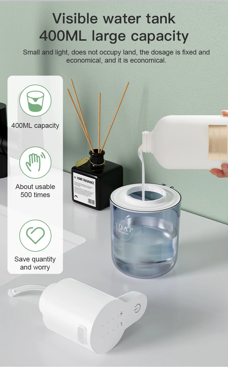 The 400ML Touchless Automatic Soap Dispenser offers a hygienic, hands-free experience with its infrared sensor technology. It features four adjustable dispensing levels, allowing precise control over soap volume to suit various needs. Its 400ML capacity reduces frequent refills, making it ideal for both home and professional settings. Designed for convenience and cleanliness, this dispenser ensures efficient handwashing while minimizing contact and contamination risk.