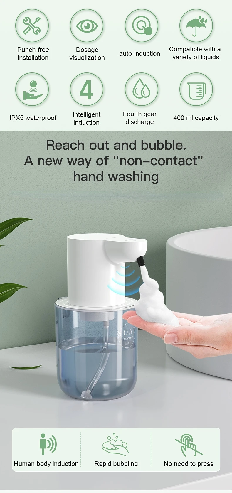1. Fast and Hygienic Operation: The touchless soap dispenser uses near-field infrared sensing to dispense foam in just 0.25 seconds, eliminating the need to press and touch, thus avoiding bacteria and ensuring a fully upgraded automatic dispensing experience.