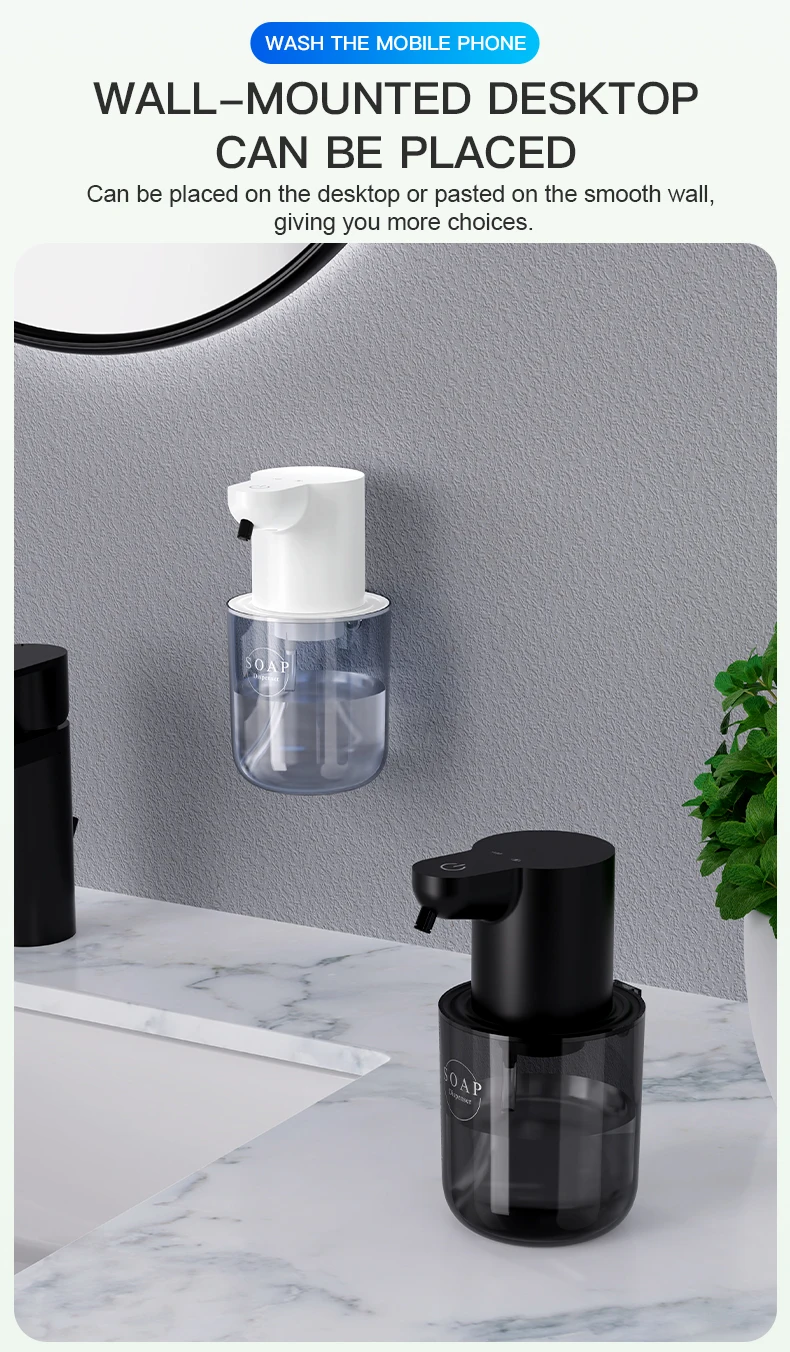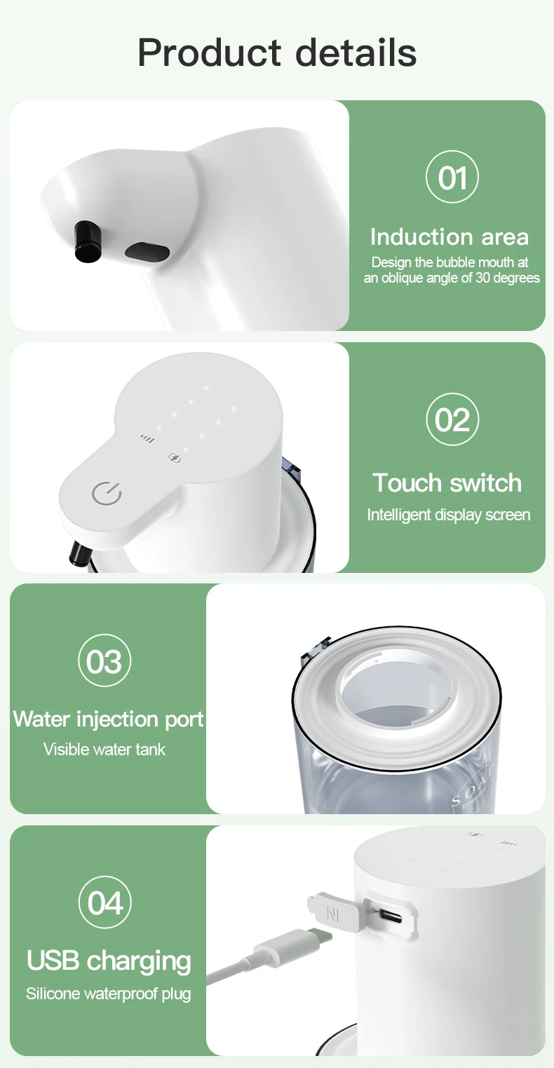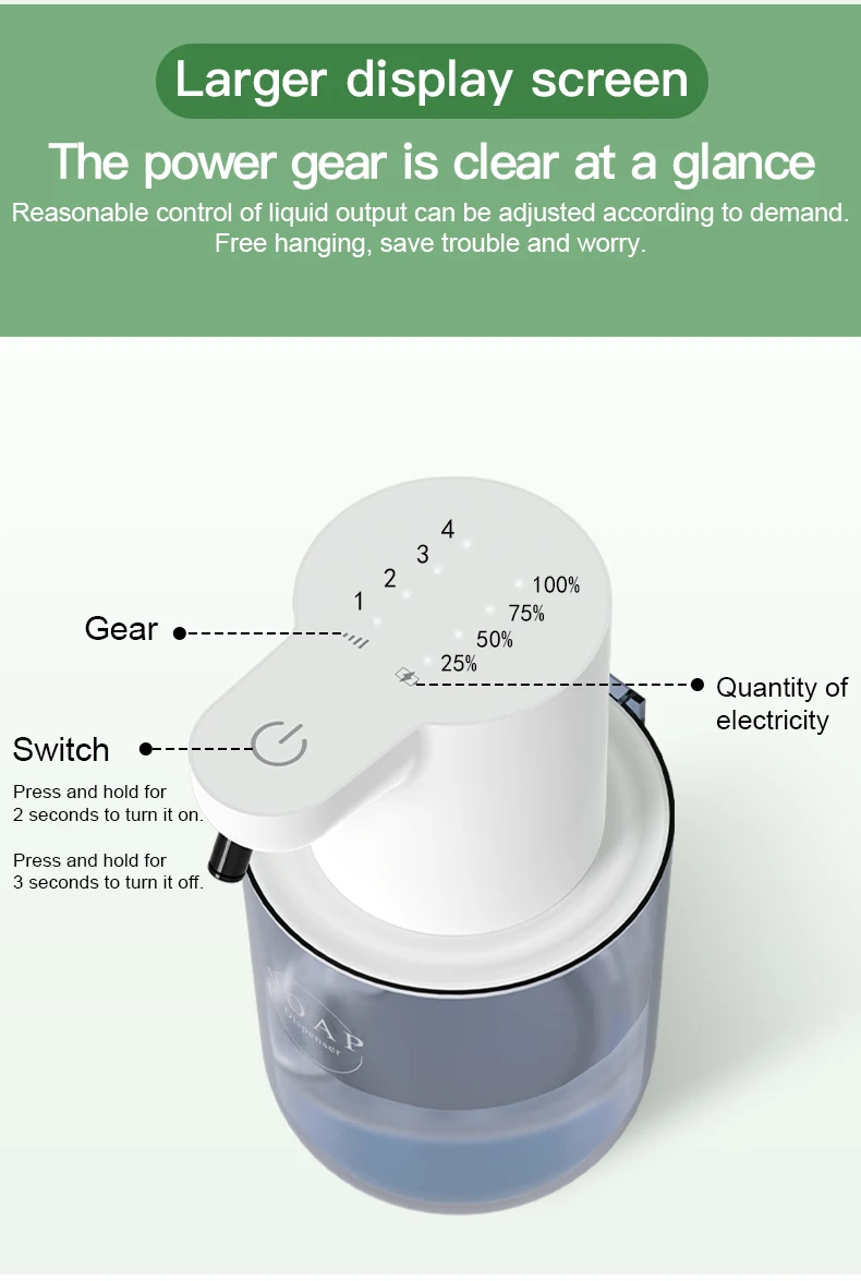 2. Long-lasting Power: The automatic soap dispenser features a large-capacity lithium battery that can be recharged, providing extended use after a single charge for added convenience.