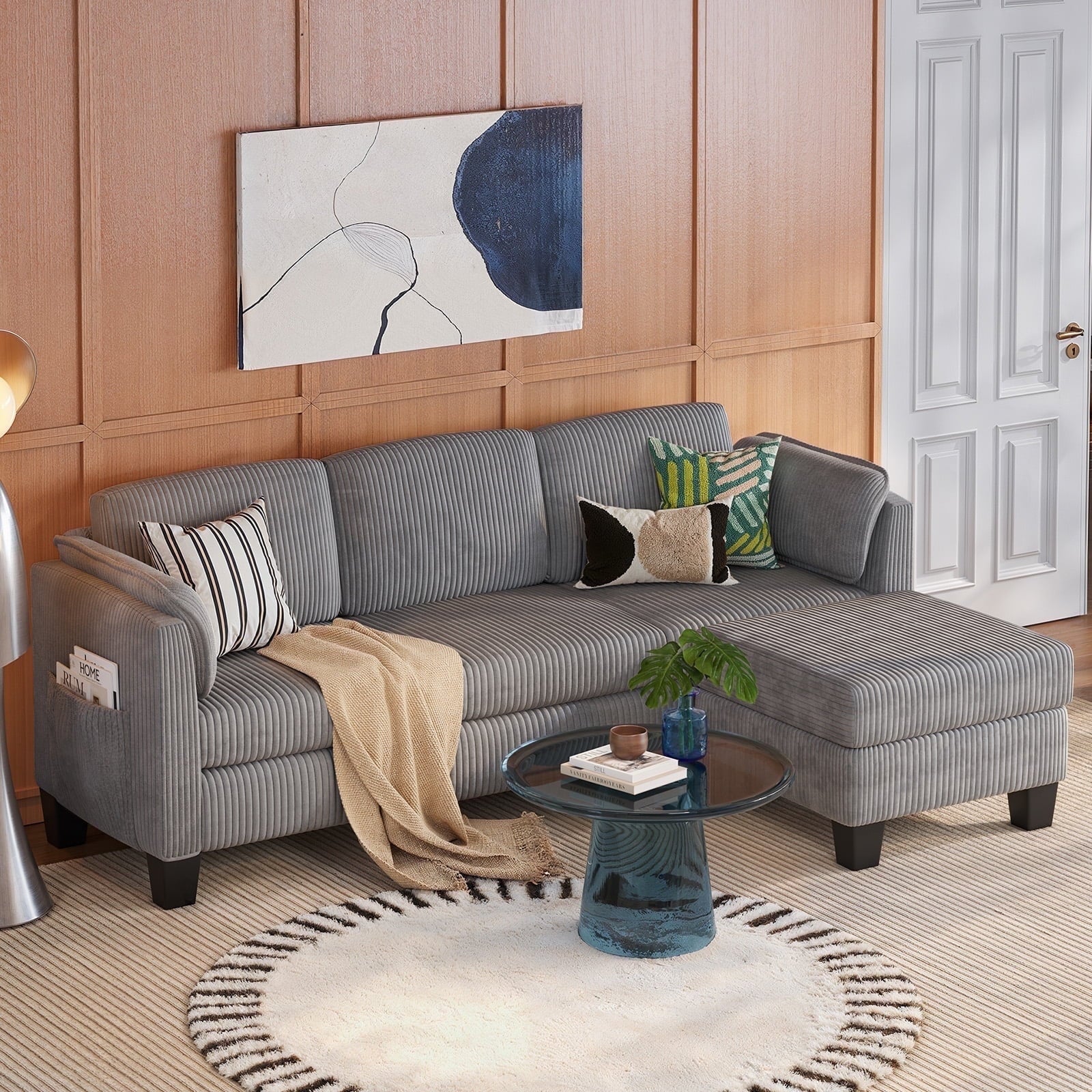 Bestier Corduroy Sectional Sofa Couches for Living Room, L-Shaped Modular Small Couch Convertible 3 Seater Sofa with Ottaman Storage,Gray