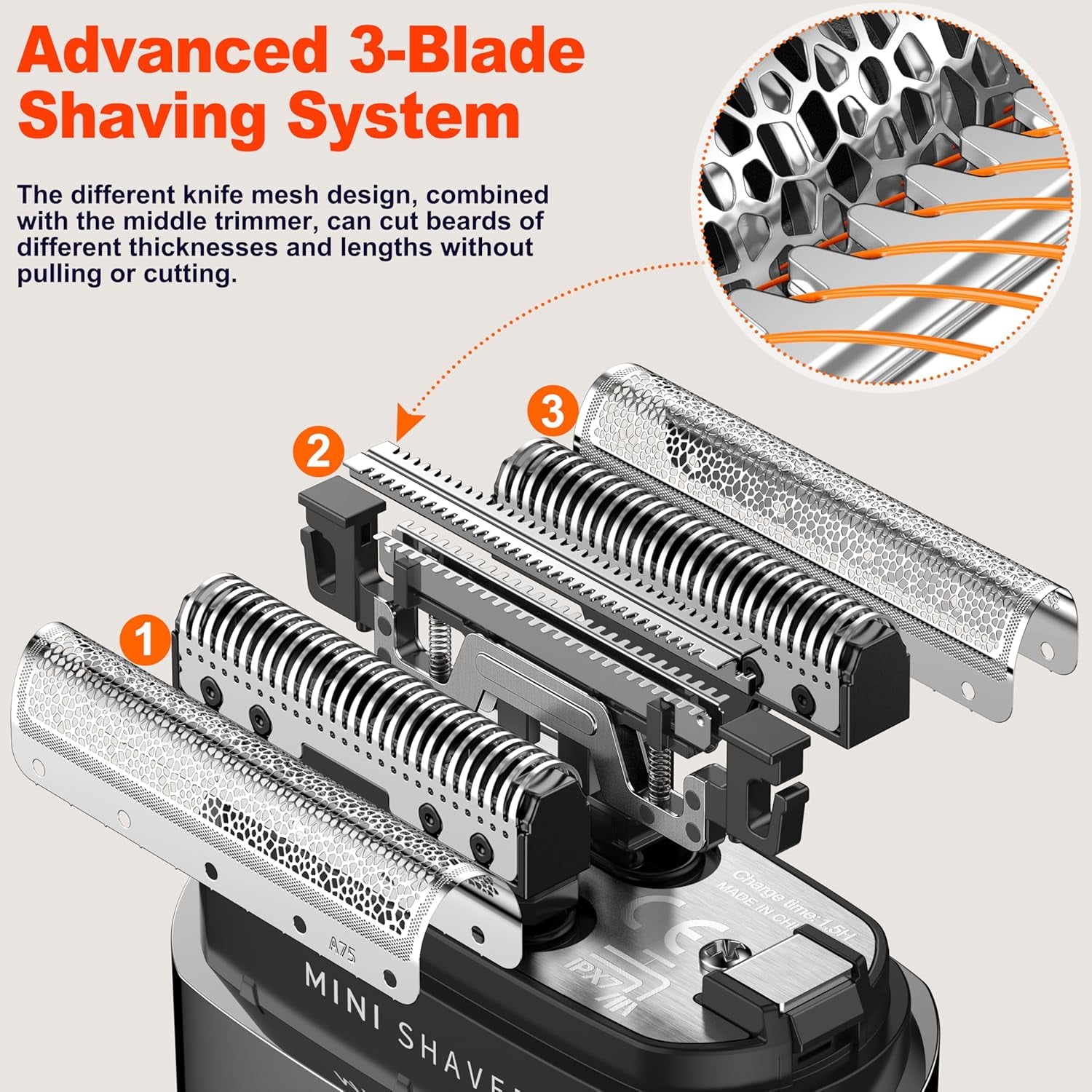 - Three-Head Design: This foil shavers for men uses an innovative three-head system. The flexible and floating heads fit the facial curve perfectly, easily cope with various facial contours, ensure that every shave is accurate and without dead angles. This men's electric shaver will give you a smooth and comfortable shaving experience.
