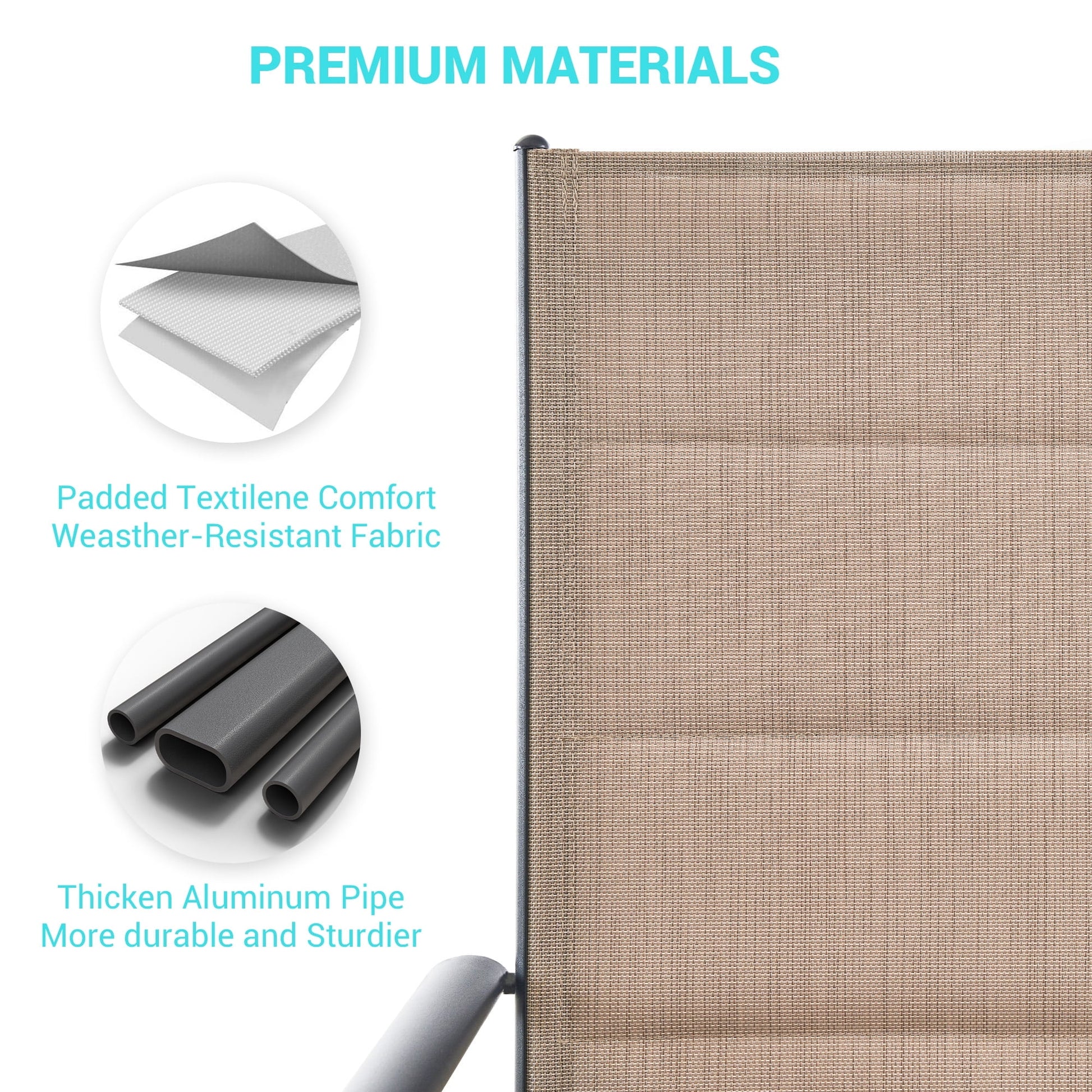 - This patio folding chair is specially designed with 7 different backrest positions. You can easily adjust the backrest angle according to your personal preferences and comfort needs to find the most suitable seating angle for yourself. Whether you want to sit upright and enjoy the sun, or want to relax and enjoy a leisurely time, this chair can meet your needs.