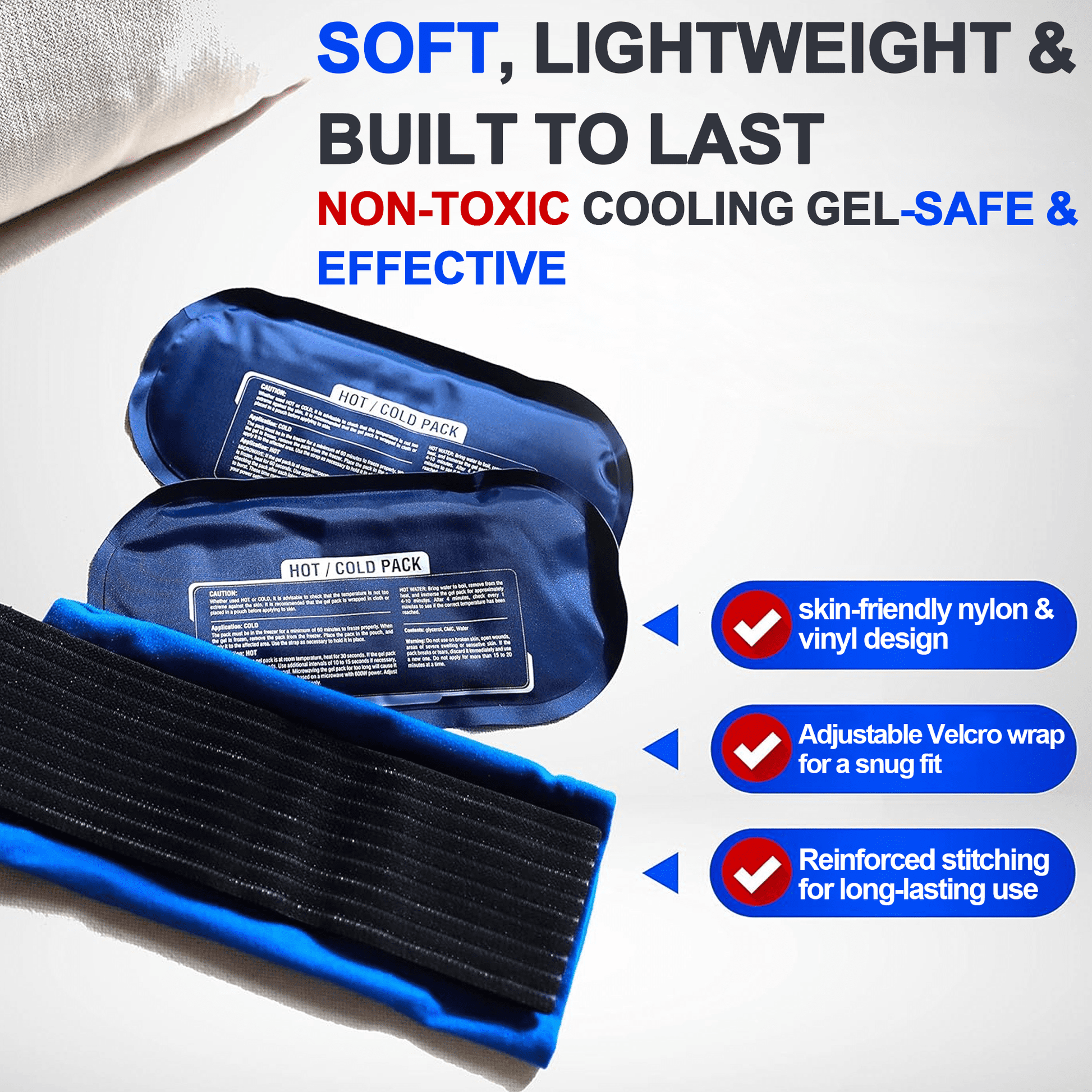 - Comfortable Pain Relief – These adjustable hot and cold packs offer therapeutic relief for myofascial, soft tissue soreness as well as stiff joints and aching muscles.