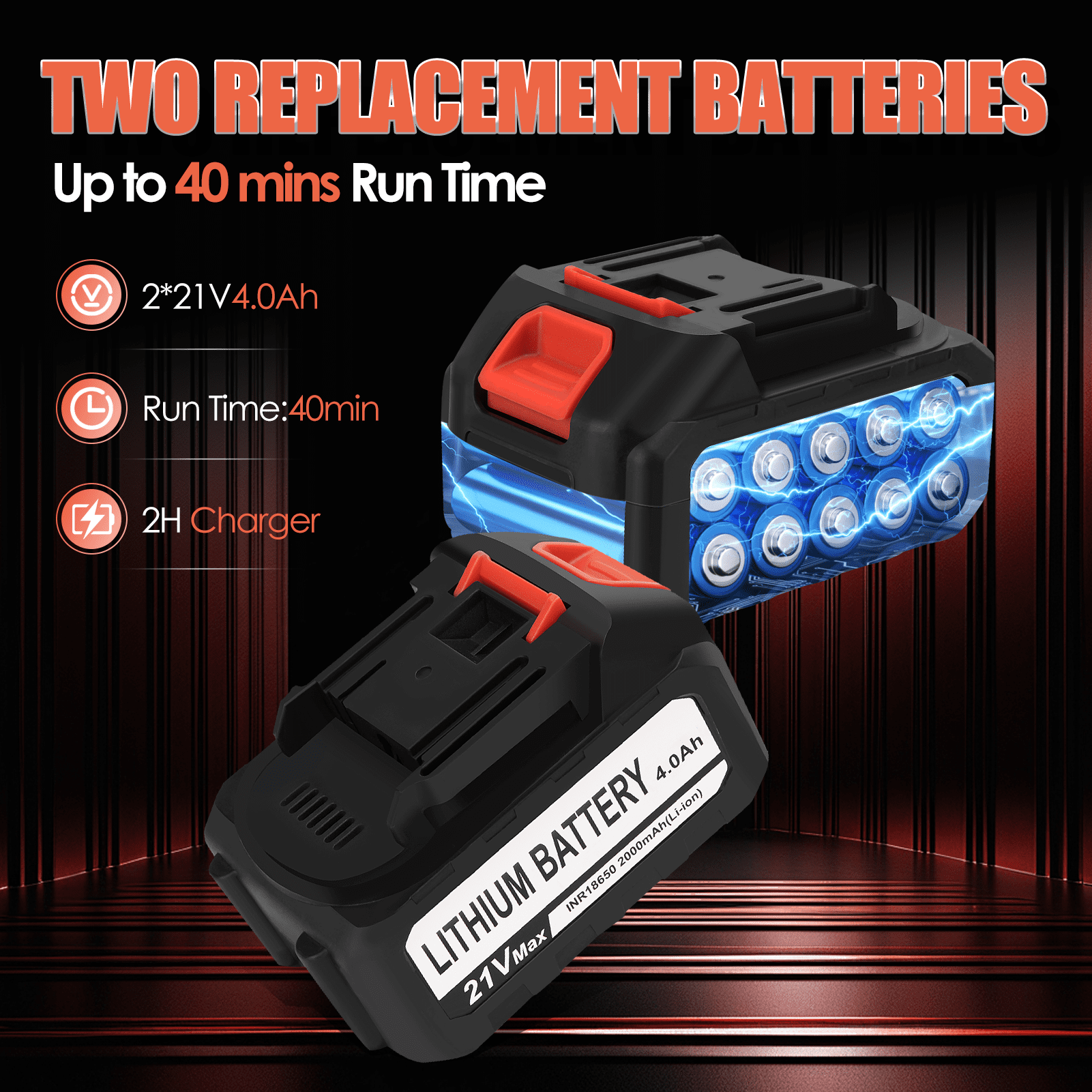 - 【Upgrade to 2 Batteries & Fast Charging】Cordless Leaf Blower comes with two 21V-4.0Ah batteries and a fast charger, it can work continuously for 40 minutes (20 minutes per battery). You don't need to wait a long time for the battery to be fully charged, the fast charger only takes 2 hour to fully charge the battery. With the Leaf Blower, you can take care of your garden and backyard more efficiently.