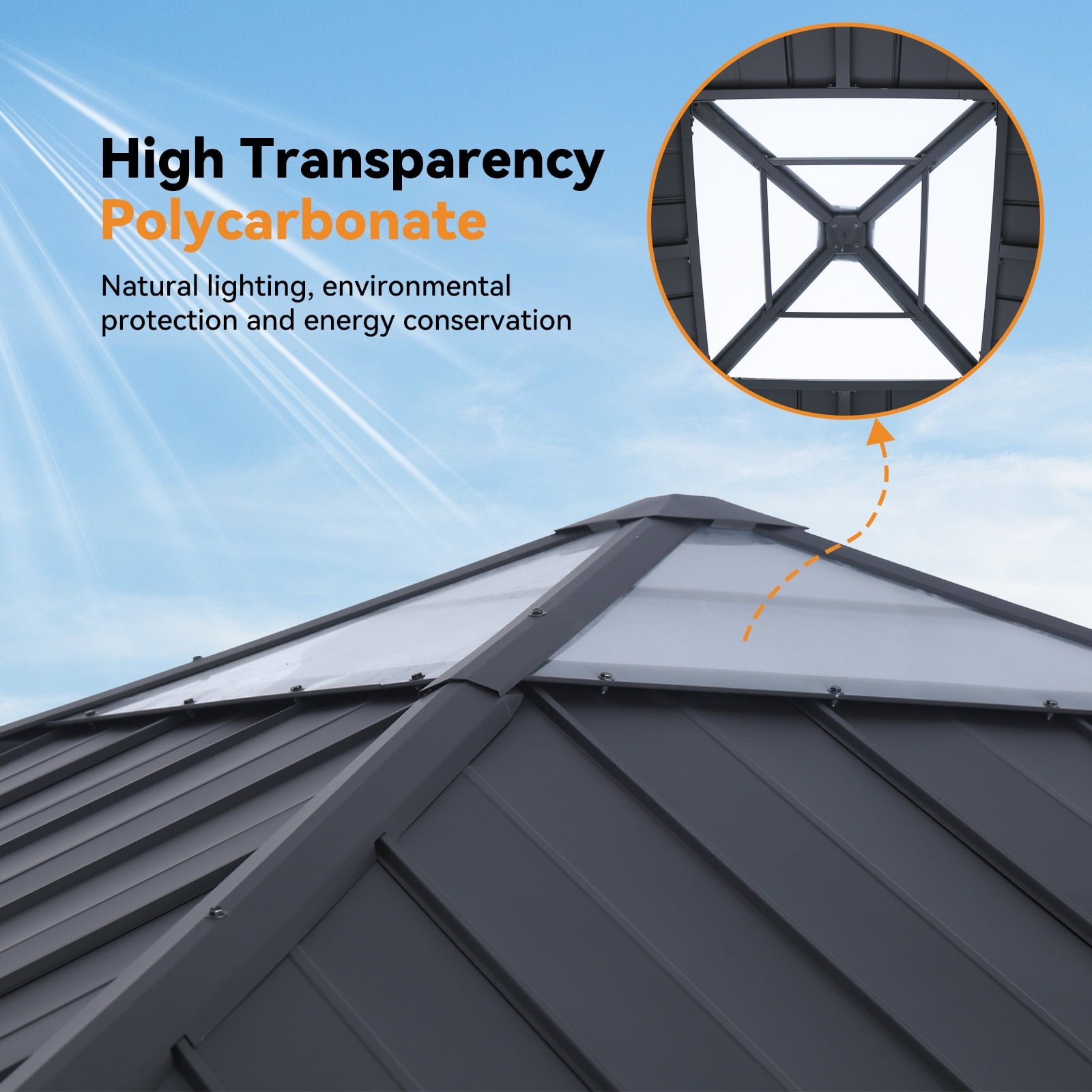 - [Light Transmittance on Top & UV Protection] The polycarbonate, semi-transparent panels at the apex of our wood gazebo allow sunlight to filter through while effectively blocking UV rays, providing a safe and comfortable environment. The high transparency glass used in the hardtop gazebo promotes natural lighting, contributing to environmental protection and energy conservation, making it an eco-friendly choice for your outdoor space.