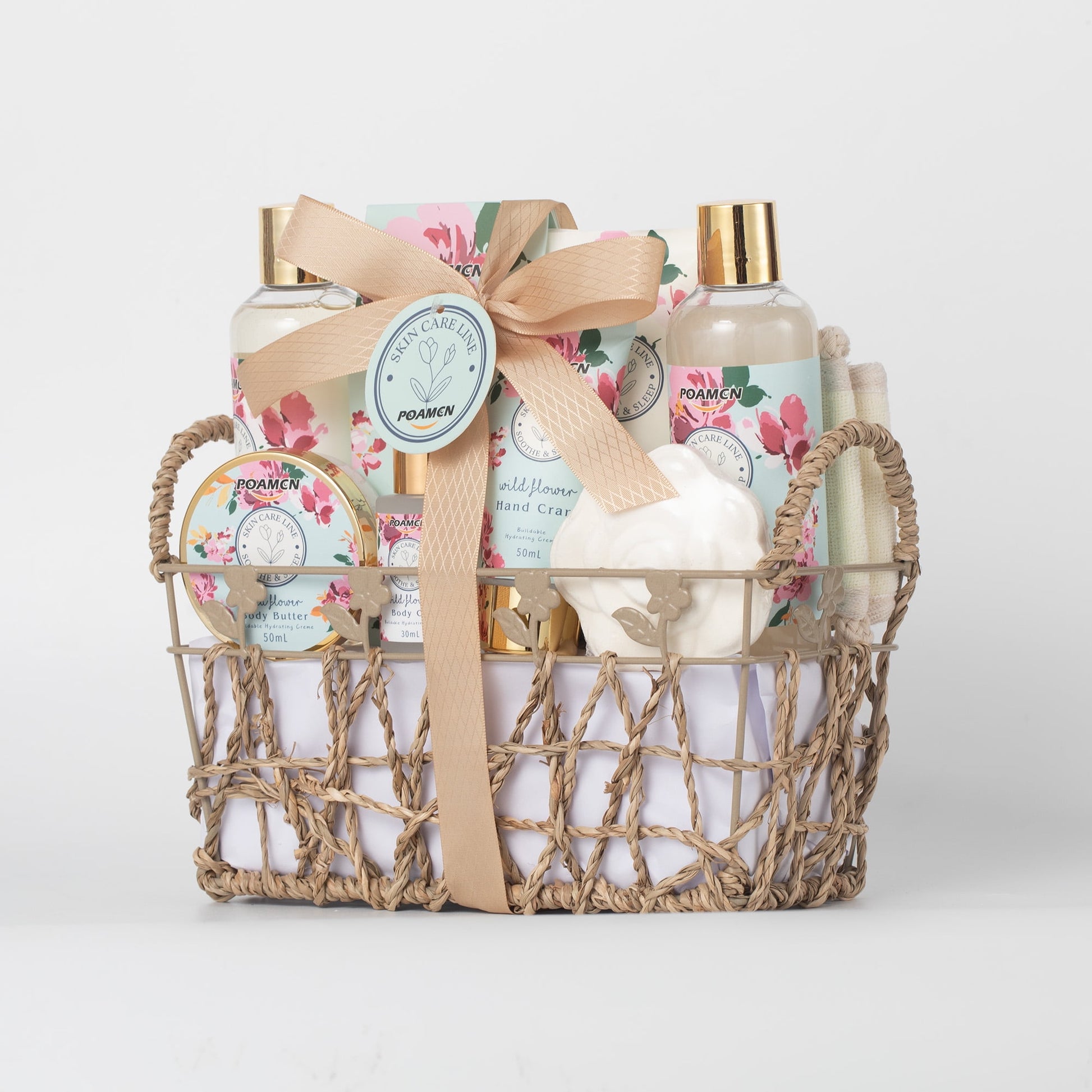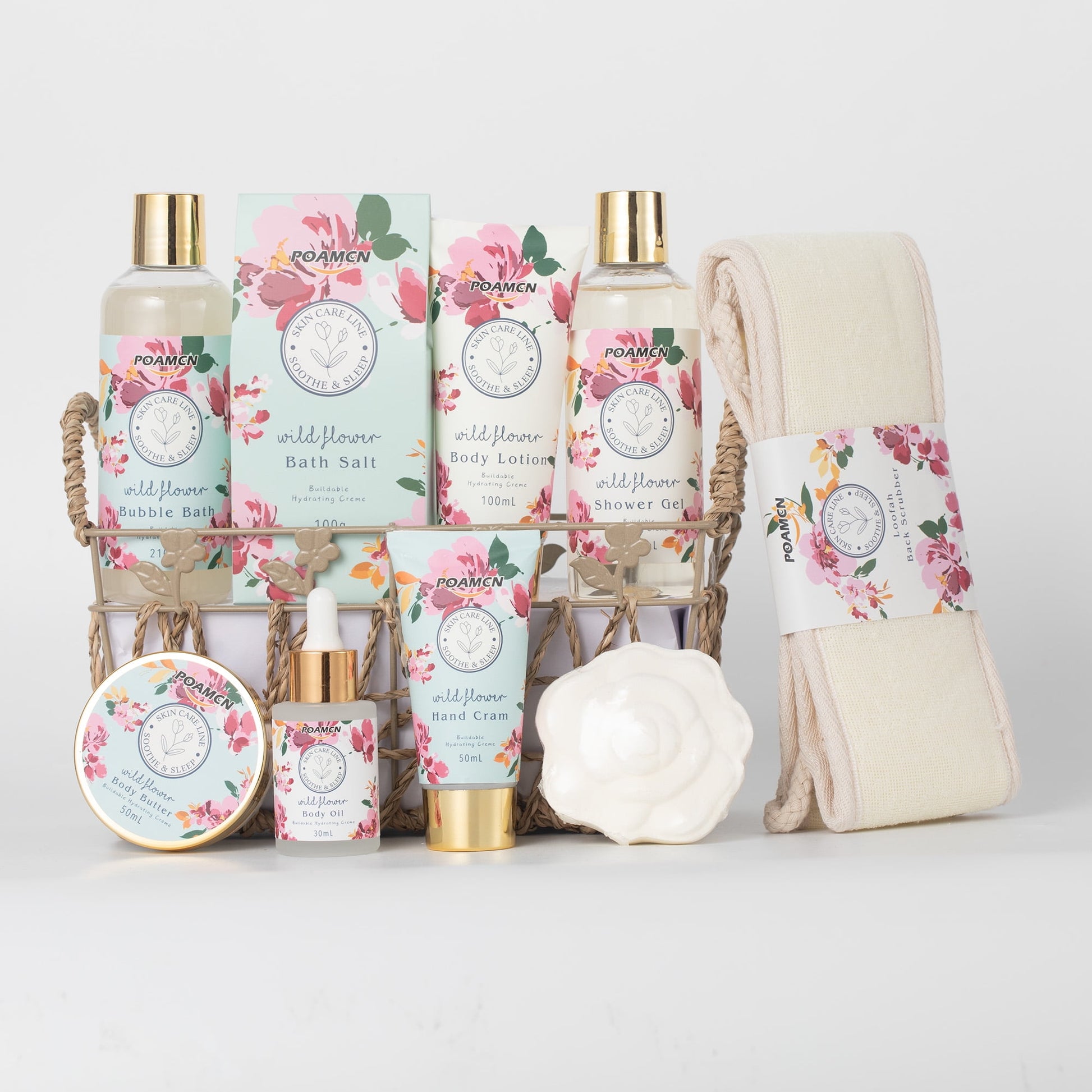 - Deluxe 9 Piece Set:This spa gift basket has everything a woman needs! It is the perfect Birthday Gifts for Women. It includes 210ml Shower Gel,210ml Bubble Bath,100ml Body Lotion,50ml Hand Cream,100g Bath Salt,50ml Body Butter,30ml Body Oil,100g Bath Bomb and Loofah Back Scrubber 1 Pc.Packed in a stunningly wrapped in a handmade basket for you to personalize it.