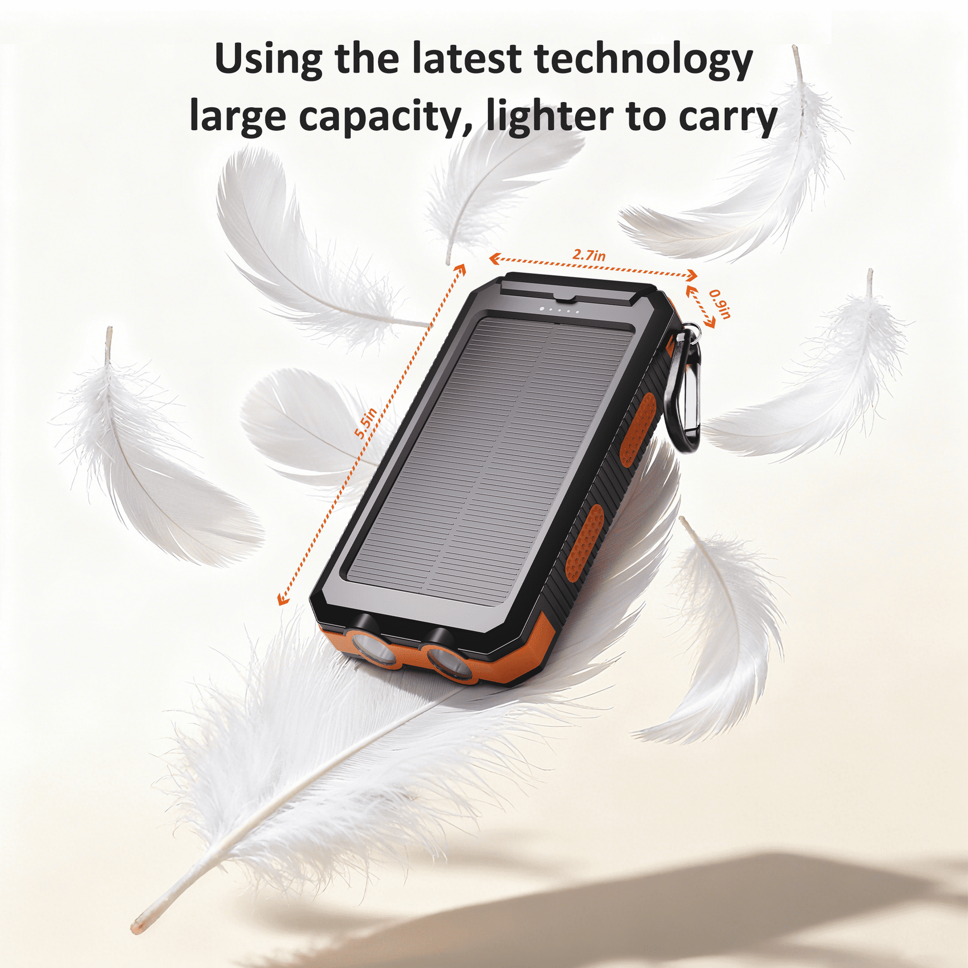 - 【Compact Design & Durable】Our portable solar charger is equipped with compass, charging port, dual lights, carabiner, etc. The top of the USB port is protected by a plastic shell. The solar charger is waterproof, dustproof and shockproof.