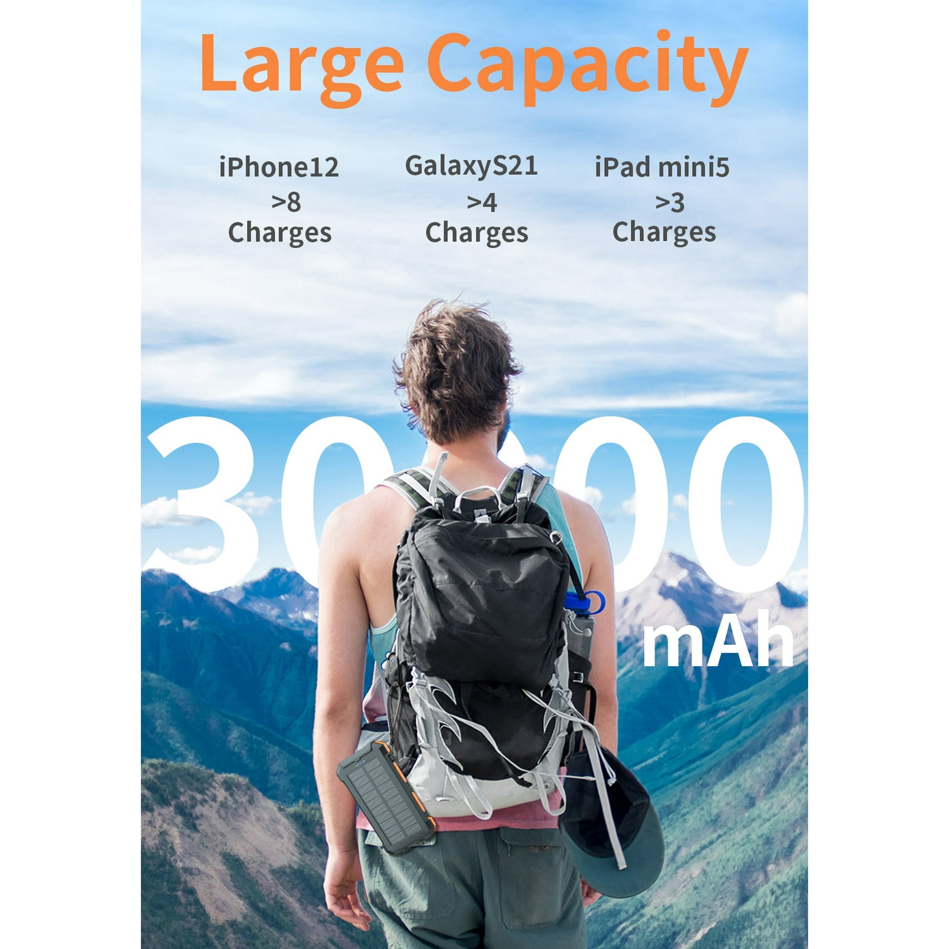 - 【30000mAh Large Capacity】This eco-friendly solar power bank is equipped with a 30000 mah large-capacity battery, which can charge the IPhone 17 5-6 times and the iPhone 17 pro max 4-5 times. There is no need to worry about power outages caused by natural disasters such as hurricanes. It is a family-friendly choice