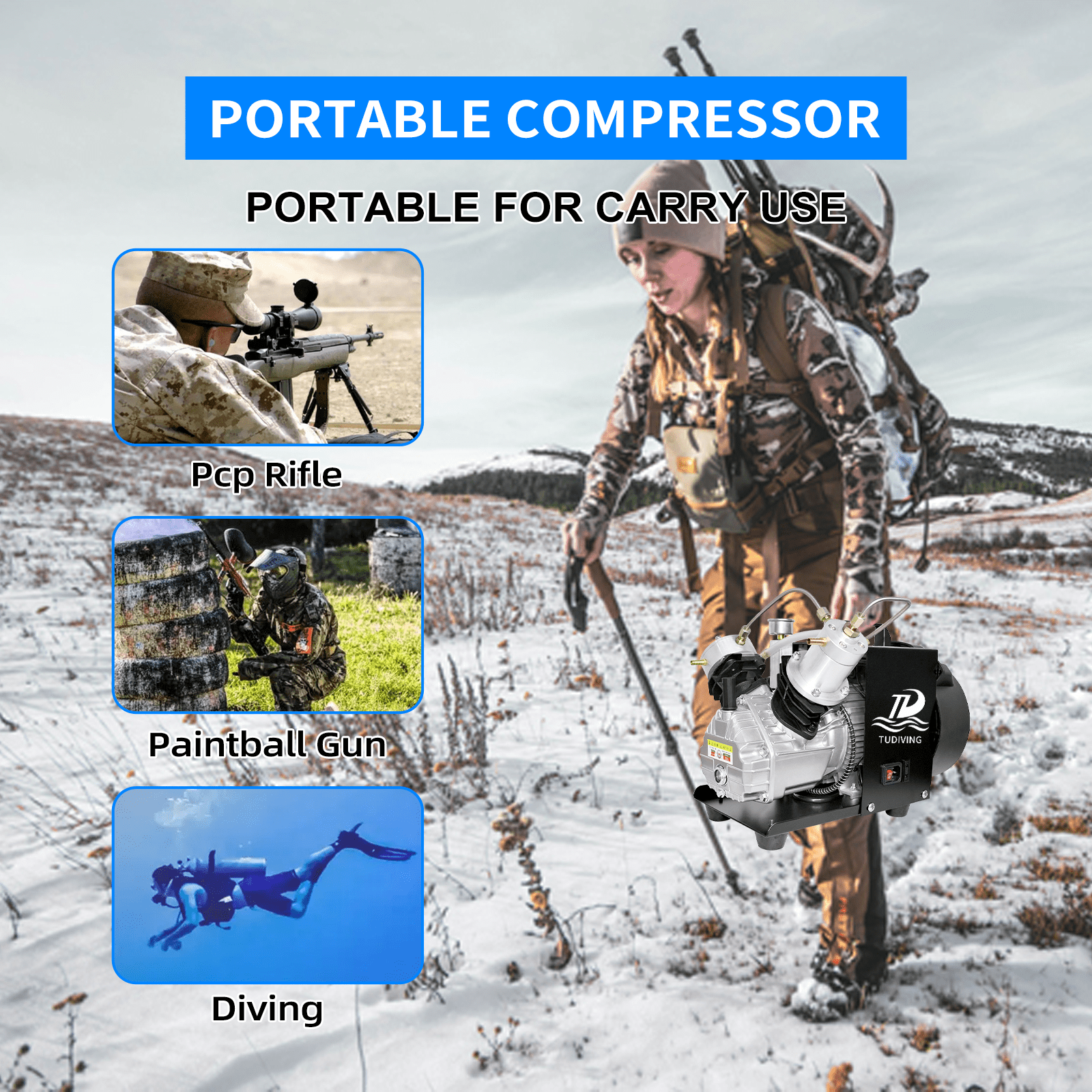 TUDIVING PCP Air Compressor 4500Psi/300Bar Double Cylinder High Pressure Air Pump 40L/min 110V